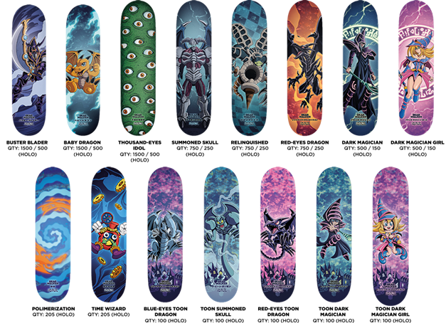 Series 2’s hand-carved decks are also still available, featuring 100 each of the Collectors Edition Toon Dark Magician and Collectors Edition Toon Dark Magician Girl cruiser decks. There are also the Open Edition Toon Dark Magician and Open Edition Toon Dark Magician Girl decks. However, these do not have the character printed on the back of the deck, are not numbered, and do not come with a certificate of authenticity.