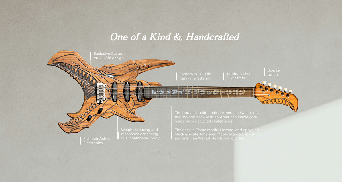 Bear Walker Industries’ have released their next hand-carved Yu-Gi-Oh! product: a Red-Eyes Black Dragon electric guitar. This guitar replicates the lines and curves of Joey Wheeler’s iconic ace monster, and only 25 will be produced.