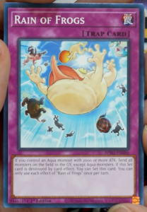 If you control an Aqua monster with 2000 or more ATK: Send all monsters on the field to the GY, except Aqua monsters. If this Set card is destroyed by card effect: You can Set this card. You can only use each effect of “Rain of Frogs” once per turn.