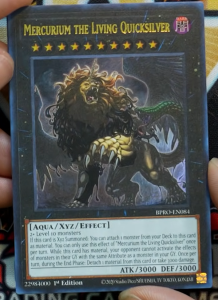 If this card is Xyz Summoned: You can attach 1 monster from your Deck to this card as material. You can only use this effect of “Mercurium the Living Quicksilver” once per turn. While this card has material, your opponent cannot activate the effects of monsters in the GY with the same Attribute as a monster in your GY. Once per turn, during the End Phase: Detach 1 material from this card or take 3000 damage.
