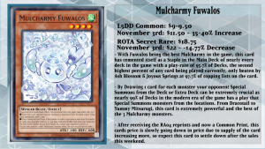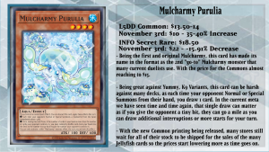 Once again, we are back to talking about the Mulcharmy Trio, as they recently received a new reprint in Common Rarity from the Legendary 5D’s Decks. Mulcharmy Purulia, being the first released of the three, allows you to draw 1 card each time your opponent Normal or Special Summons a monster(s) from their hand, which is amazing against many Decks that want to Summon from the hand, like Vanquish Soul K9, Pure Yummy, and Ryzeal. This has been an essential card for plenty of Decks since its release and, as of recent, has been seen in 54.1% of known topping lists over the past year.