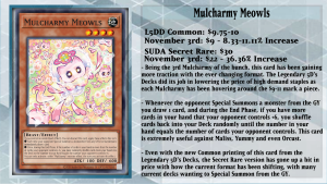 Even though all three Mulcharmies have seen a Common reprint, they still have a price tag to them, like how Ash Blossom & Joyous Springs was when it was reprinted in the Salamangreat Sanctum Structure Deck in 2019, but give it time as more players get their hands on the new Legendary 5D’s Decks, as the price will settle over time.
