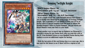 “Recently, it has been uncovered that Evening Twilight Knight is going to become a tech in Branded Decks to bridge between it and Mitsurugi.”