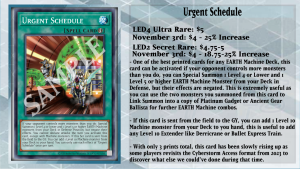 After Flying Pegasus, let’s take a look at Urgent Schedule, one of the best cards ever printed for EARTH Machine Decks ever since a bread slicer was invented. This card allows you to Special Summon 1 Level 4 or lower and 1 Level 5 or higher EARTH Machine monster from your Deck in Defense Position, provided your opponent controls more monsters than you do. The monsters you summon also have their effects negated, and you cannot declare attacks the turn you activated this card, except with Machine Monsters. Even with a few drawbacks, it’s absolutely fine, as you will be using the two monsters you summoned as Link Material for Ancient Gear Ballista, so you can search for Ancient Gear Box, which then adds a monster from your Deck to your hand with 500 ATK or DEF. This combo is used to search for Infinitrack Tunneller, then you can Tribute Ancient Gear Ballista to Special Summon it from your hand to gain access to a Level 5 monster for future Link plays, or use it with another Level 5 to Xyz Summon Infinitrack River Stormer. Another thing about Urgent Schedule is if it is sent from the field to the GY while Set, you can add any Level 10 Machine monster from your Deck to your hand. This is perfect for searching for Super Express Bullet Train or Heavy Freight Train Derricrane for a free extender or boss monsters like Machina Citadel or Machina Ruinforce.