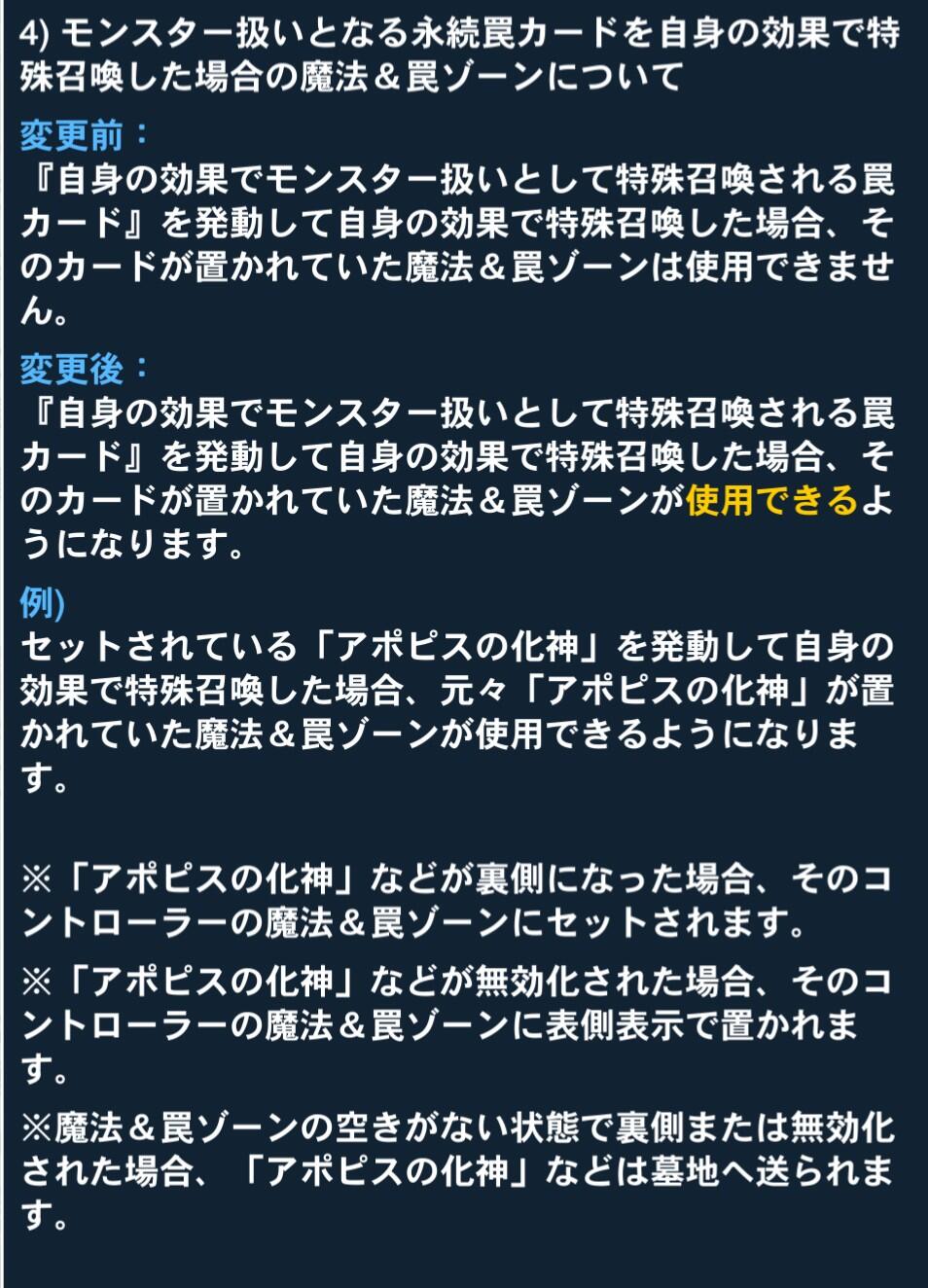 (Ness Clarification: In the Japanese announcement, this bullet point refers to Embodiment of Apophis et al having their effects negated resulting in them being placed face-up in the player’s Spell & Trap Zone, not ‘being changed to face-down Defense Position’ like the English announcement says. The Japanese announcement follows existing rules. The English one is giving two different results for the same scenario of flipping the monster face-down)