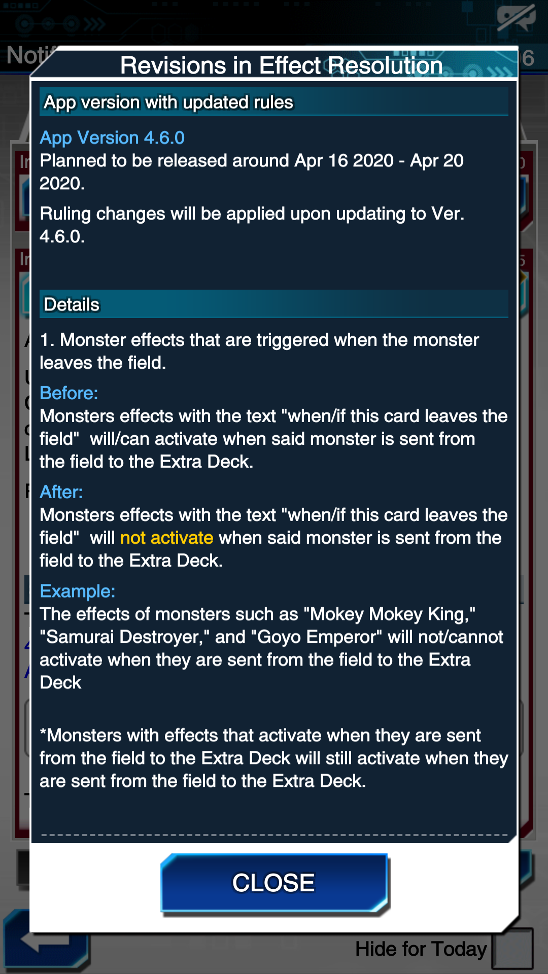 • Monsters with effects that activate when they are sent from the field to the Extra Deck will still activate when they are sent from the field to the Extra Deck.