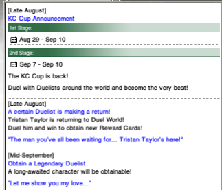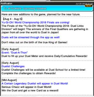 Early August will be the World Championship and a Duel-a-Thon and also Duelist Challenges at Duel School.