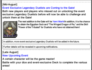 Also Mid August, Marik joins the Gate with chances to get his Winged Dragon of Ra and Power of the Tribute Skil.