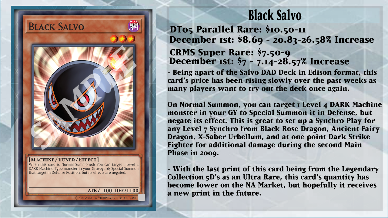 Black Salvo is another rising star currently, as players are going back to play Salvo DAD Decks in the SJC Edison Format. This card is handy for decks, being a Level 3 Tuner monster and all, and when it is Normal Summoned, you can target 1 Level 4 DARK Machine monster in your GY and Special Summon it in Defense Position, but its effects are negated. This was mainly used to Special Summon a copy of Dekoichi the Battlechanted Locomotive in order to Synchro Summon a Level 7 Synchro Monster, mainly Black Rose Dragon (to destroy all cards on the field) or Ancient Fairy Dragon (to Special Summon 1 Level 4 or lower monster from your hand). However, if you control Cyber Dragon, you can send all Machine monsters on the field to the GY to Special Summon a copy of Chimeratech Fortress Dragon with a minimum of 3000 ATK. Another card that you could Synchro Summon when it was Legal and unerrata’d was Dark Strike Fighter the year prior, before its banning at the time, to help close out the game if you managed to get a copy of Dekoichi in the GY to maximize your damage output.
