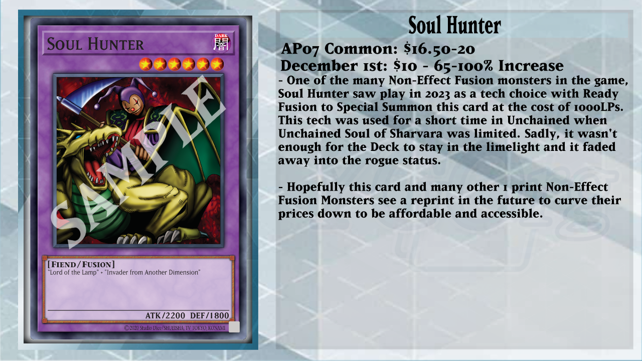 Now for the other card, it’s an old-school Fusion Monster from the earliest days of the game, and that being Soul Hunter. As a Common from Astral Pack 7, this card and many old non-Effect Fusion Monsters haven’t seen a reprint, causing their prices to increase. But this Level 6 DARK Fiend Monster has seen play from Unchained when Sharvara was limited, with players picking it up for an unknown reason. Maybe for a Hecahands tech. But whatever is going on with this card again, hopefully it shows up soon in a future topping list. Oddly enough, being a Level 6, this card can be used as a material for Jinzo – Layered if you want to run Ready Fusion in your lists for this idea.