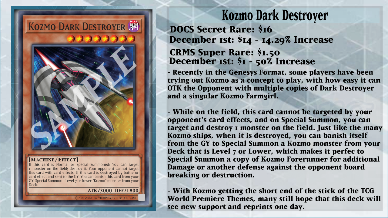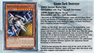 Kozmo Dark Destroyer was recently pointed out, as its Secret Rare version has been rising over the past few months due to talk of the Deck in Genesys Format. Despite having two cheaper prints of this card from Premium Gold: Infinite Gold and Maximum Gold, the original print of the card from Dimension of Chaos is something to look out for. Being one of the best monsters for the Deck, this card cannot be targeted by your opponent’s card effects, and when it’s Normal or Special Summoned, you can target 1 monster on the field and destroy it. Another great part of this card is if it is destroyed by battle or card effect and sent to the GY, you can banish it from your GY to Special Summon a Level 7 or lower Kozmo monster from your Deck. This is a part of the whole gimmick of Kozmo, where the destroyed ships can Special Summon the next ship or pilot in line, so you have extra protection from destruction or battles. Even back in 2015, this Deck was scary because if you had a Kozmo Farmgirl paired with a Kozmo Dark Destroyer on the field, you could easily OTK the opponent. As with Kozmo Farmgirl, she can search for an additional copy of Dark Destroyer at the cost of 500 LP, then attack with the current Dark Destroyer on the field, then tag out the Farmgirl on the field to Special Summon the new Dark Destroyer from the hand. This triggers Dark Destroyer to destroy the other Dark Destroyer you control, triggering its effect to Special Summon a copy of Kozmo Forerunner from the Deck, dealing a total of 10300 points of damage.