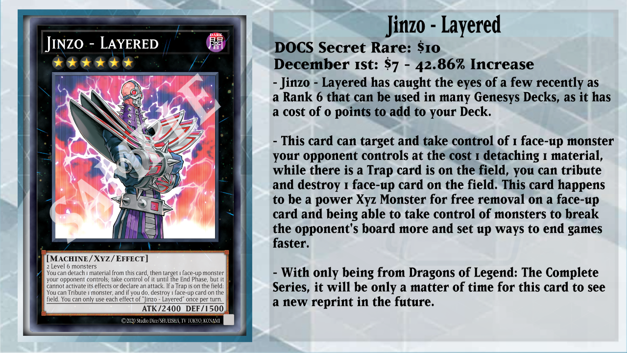 The next pair of cards are unrelated but have one thing in common, and that is being cards with a single print. Jinzo – Layered happens to be the first of the two cards. This Rank 6 Xyz was printed in Dragons of Legend: The Complete Series as a Secret Rare, and it takes 2 Level 6 Monsters to Xyz Summon it. This card has uses in specific decks, as it can detach 1 material to take control of 1 face-up monster your opponent controls until the End Phase, and if a Trap is on the field, you can Tribute 1 monster to destroy 1 face-up card on the field. Both effects of this card are useful, as it has a form of removal and can take control of a monster, which can be crucial, as we’ve seen in the past, especially with Triple Tactics Talents taking a Primal Being Token, or if you control a Continuous Trap Card to help push through the opponent’s board.