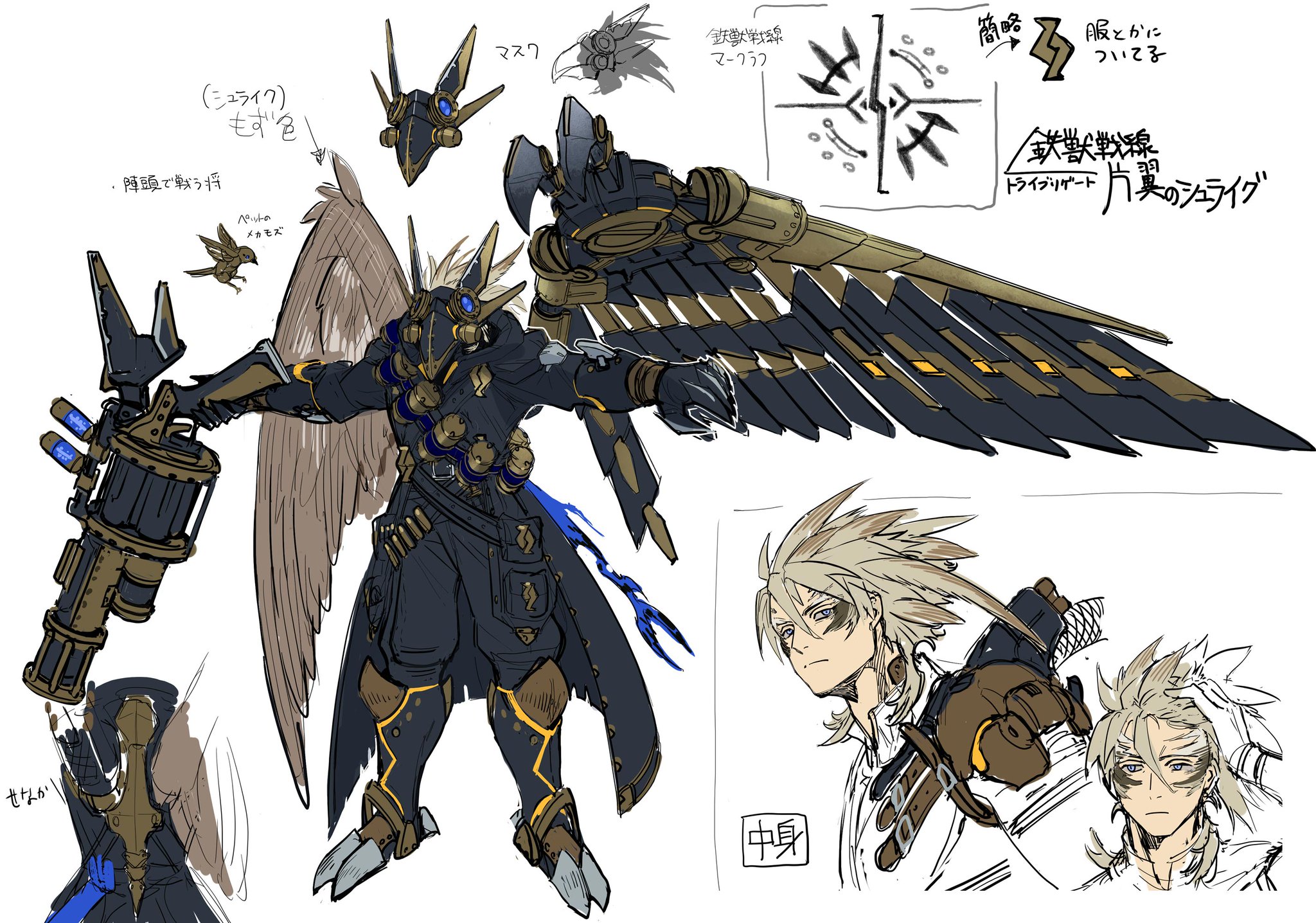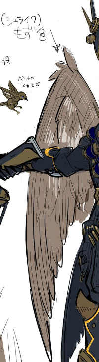 As an interesting note, the name in this concept art is not “鉄獣戦線 凶鳥のシュライグ” (Tribrigade Shrike the Wicked Wings), but “鉄獣戦線 片翼のシュライグ” (Tribrigade Shrike the One-Winged, replacing “凶鳥”, wicked bird, for “片翼”, one-winged)