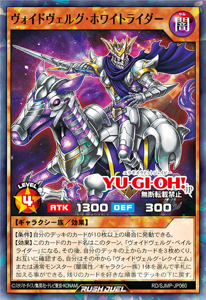 【EFFECT】 This card’s name becomes “Voidvelg Palerider” for the rest of this turn. Then, excavate the top 3 cards of your Deck and reveal them. You can choose 1 “Voidvelg Requiem” or DARK Galaxy Normal Monster and add it to the hand. Place the remaining cards on the bottom of your Deck in any order.
