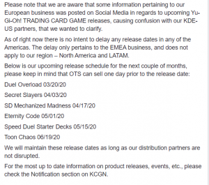 Please note that we are aware that some information pertaining to our European business was posted on Social Media in regards to upcoming Yu-Gi-Oh! TRADING CARD GAME releases, causing confsion with our KDE-US partners, that we wanted to clarify.