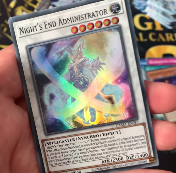 If this card is Special Summoned, or if another Spellcaster monster(s) is Special Summoned to your field: You can target 1 card in your opponent’s GY: banish it. If this card is destroyed by battle, or if this card in its owner’s Monster Zone is destroyed by an opponent’s card effect: You can target 1 Level 4 or lower Spellcaster monster in your GY; Special Summon it. You can only use this effect of “Night’s End Administrator” once per turn.