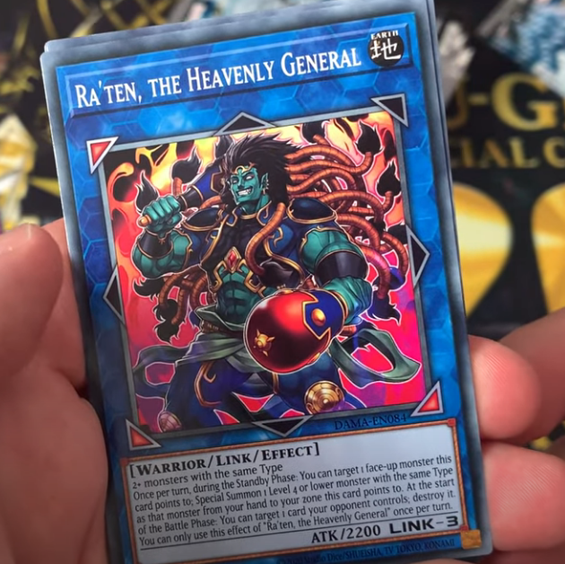 Once per turn, during the Standby Phase: You can target 1 face-up monster this card points to; Special Summon 1 Level 4 or lower monster with the same Type as that monster from your hand to your zone this card points to. At the start of the Battle Phase: You can target 1 card your opponent controls; destroy it. You can onlly use this effect of “Ra’ten, the Heavenly General” once per turn.