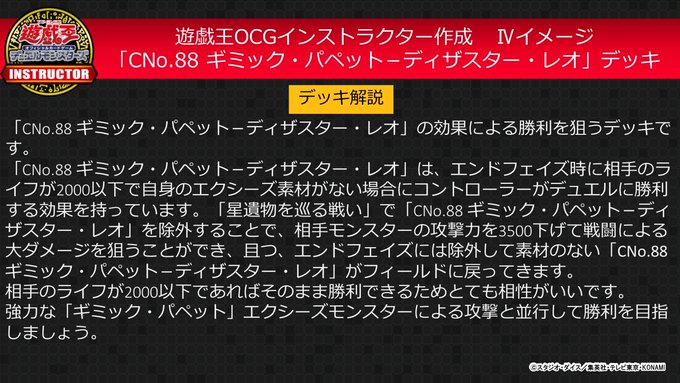 • “Number C88: Gimmick Puppet Disaster Leo” has a win the Duel effect if it has no material and your opponent has 2000 or less LP. Banish it with “World Legacy Clash” to lower a monster’s ATK by 3500 for huge damage, and then during the End Phase, “Number C88: Gimmick Puppet Disaster Leo” returns to the field.