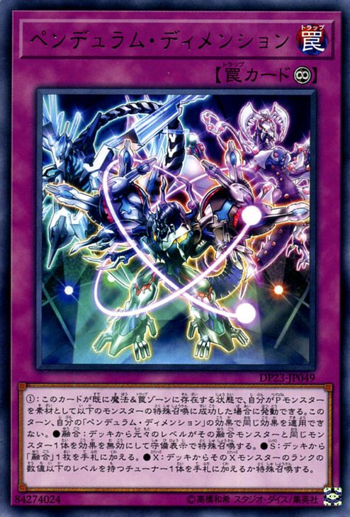 (1) When you Special Summon a monster of one of the following types by using a Pendulum Monster(s) as material while this card is in the Spell & Trap Zone: You can activate the appropriate effect, but you cannot apply the same effect of “Pendulum Dimension” again this turn.