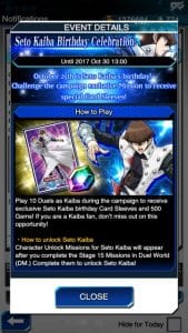 For Kaiba’s Birthday, until October 30th or so, if you play 10 Duels as Seto Kaiba you’ll recieve Kaiba sleeves unique for this birthday event, and 500 Gems.
