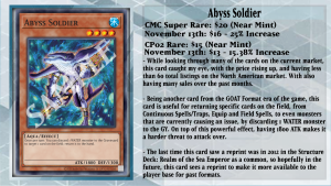This week, there were some notable past format cards that have been making it big, and Abyss Soldier is one of them. With the North American market having less than 70 total listings and the European market hitting 300 total listings, it is shocking that this card hasn’t seen a reprint for so long, with the last time being a printing in the 2012 Realm of the Sea Emperor Structure Deck. It is a great card in formats like GOAT, as it allows you to, once per turn, discard 1 WATER monster to return 1 card on the field. This is a great way to remove Continuous Spells/Traps, Field Spells, and Equip Spells. It can also get rid of problematic monsters on the field. It can even return your own cards like Call of the Haunted, Premature Burial, and Snatch Steal, allowing you to reuse them and apply those cards to a different target.
