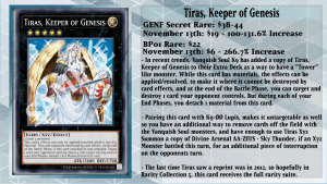 Over the past few months, it has been noticed that Tiras, Keeper of Genesis, has been seen in multiple topping Vanquish Soul K9 lists. On the surface, this Rank 5 doesn’t seem like much, but when you look into it more, it makes out to be one of the best cards to use for Divine Arsenal AA-ZEUS – Sky Thunder, as while it has material, Tiras cannot be destroyed by card effects, and if you have a copy of K9-ØØ Lupis as 1 of its materials, your opponent can no longer target it. This makes Tiras a tower-like monster. At the end of the Battle Phase, if it has battled, you can target a card your opponent controls and destroy it, making this extremely powerful removal, as it helps clean up the opponent’s board, making them lose out on an additional card. Then, during your Main Phase 2, you can Xyz Summon a copy of AA-ZEUS, and it’ll gain the additional effect of K9-ØØ Lupis as mentioned earlier.