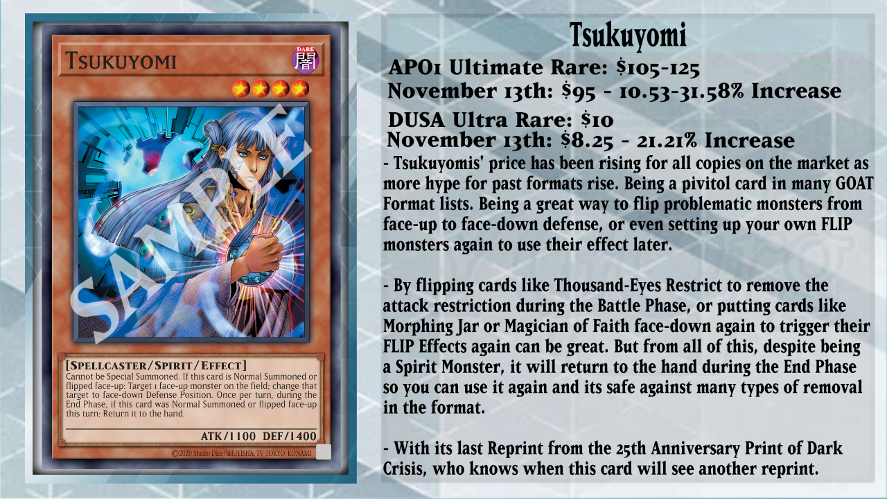 Tsukuyomi happens to be another card where listings are getting extremely low over the years, and it’s because of how good this card is, as when it’s flipped face-up or Normal Summoned, you can target 1 face-up monster on the field and flip it to face-down Defense Position. With it having only 1100 ATK, it can take care of weaker monsters on its own, but when paired with a stronger monster, it can help remove them from the field through battle. Even then, it can help set up Flip Effect Monsters that you control, like Morphing Jar (to make each player discard their entire hands and draw 5 new cards) or Magician of Faith (to add a Spell Card from your GY to your hand). Since it is a Spirit Monster, it returns to the hand during the End Phase, and it cannot be Special Summoned, so it can be reused on the next turn.