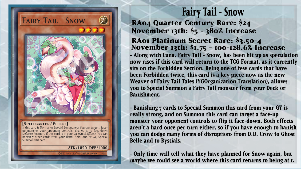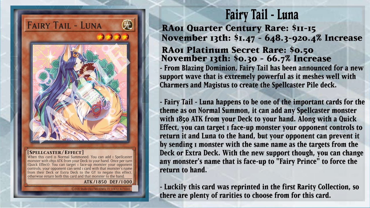 So much is going on this week in the market, from new Fairy Tail support being announced to give new life to the archetype to plenty of older cards getting bought out for past and modern formats. It’s been interesting reading up on the feature matches from this past North American Remote Duel YCS, with Sabit Zada winning the event with Vanquish Soul K9. So let’s dive into the 50th Market Watch and see what has been going on.