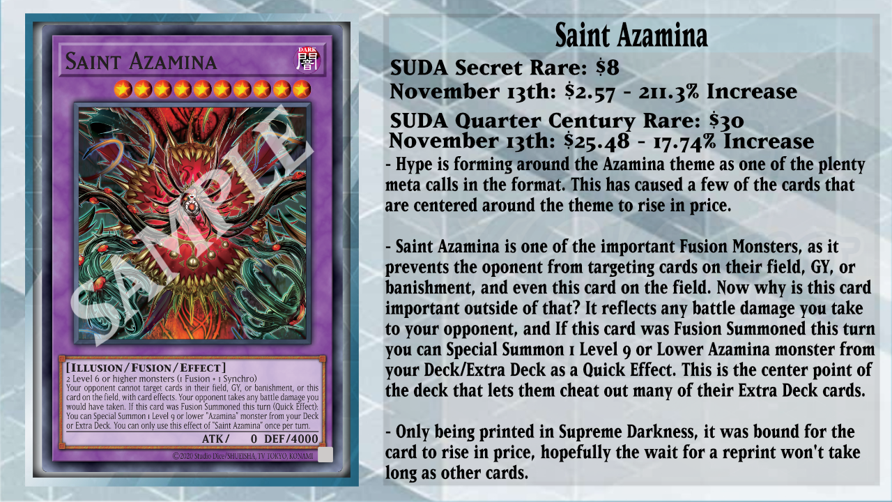 Recently and finally, I’ve been eyeing Saint Azamina as one of the plenty of Secret Rares printed this year, as some dedicated duelists have been playing the Azamina Sinful Spoils Deck. In the past month, a total of 2 duelists have topped their regional event with the Deck, and both were running 2 copies of Saint Azamina. With it needing 2 Level 6 or higher monsters for its Fusion Summon, 1 Fusion, and 1 Synchro, this card is absurd, as it prevents the opponent from targeting cards in their field, GY, or banishment, or this card on the field with card effects. They also take any battle damage you would have taken. One of the best things about this card is if it was Fusion Summoned that turn, you can quickly Special Summon 1 Level 9 or lower Azamina monster from your Deck or Extra Deck. This is extremely important, as it can Summon out Elzette, Azamina of the White Forest, or Queen Azamina from your Main Deck, while it can also Summon Azamina Ilia Silva, which is an Omni-Negate that can negate any card or effect that your opponent activates. You can even Summon Azamina Moa Regina, which can target and Special Summon any Illusion monster in your GY, and when an Azamina or Sinful Spoil card or effect is activated, you can quickly target 2 cards on the field and destroy them. All these options and effects make Saint Azamina ridiculously powerful, and it’s great to see duelists exploring this Deck after so long, especially in the current meta that is flooded by Mitsurugi, Yummy, Dracotail, Maliss, and K9 decks.