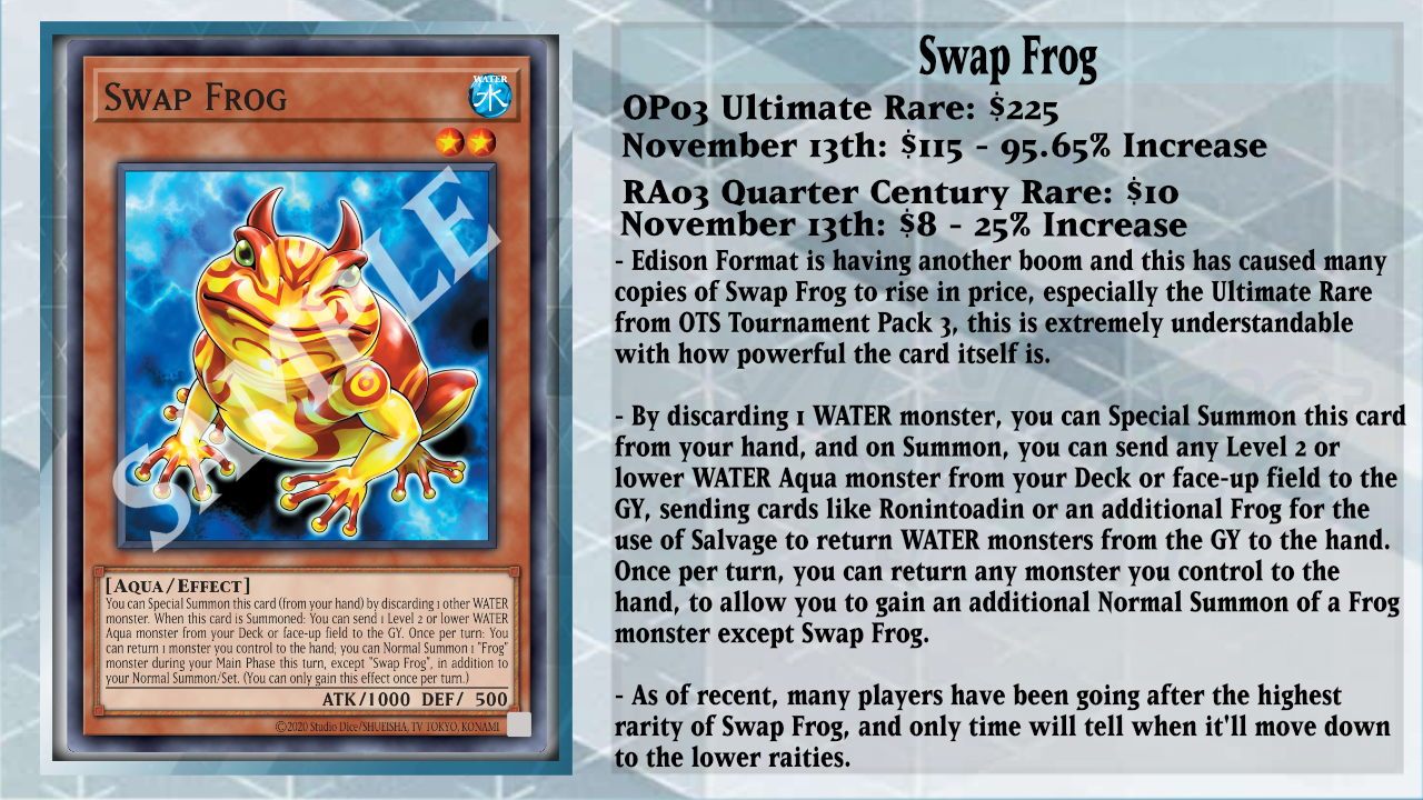 For the final past format card, we have Swap Frog, one of the best cards in Edison Format and Early POTE Format for Spright. This card is extremely powerful, as you can discard 1 other WATER monster to Special Summon Swap Frog from your hand, and when it’s Normal or Special Summoned, you can send any Level 2 or lower WATER Aqua monster from your Deck or face-up field. Neither of these effects is once per turn either. In addition, you can, once per turn, return 1 monster you control to the hand to gain the ability to Normal Summon 1 other Frog monster in addition to your usual Normal Summon/Set. The main card to send with Swap’s effect was previously Ronintoadin until its placement on the Forbidden section of the TCG list on the October 2023 List. These days, Nimble Angler is the primary option, as its GY effect would Special Summon 2 Nimble monsters from your Deck, allowing you to make a free Rank 2 or Link-2 in the modern game. For the past formats, you can send cards from Ronintoadin and plenty of other Frogs for Frog FTK, or send cards like Treeborn Frog to set up your next turn with cards like Caius the Shadow Monarch, or an additional Tribute fodder for Light and Darkness Dragon. The Ultimate Rare has been rising rapidly over the past few months, while the other copies are starting to follow. Swap Frog will be a timeless card, and it’ll always be a sought-after card for many who have played this game for years.