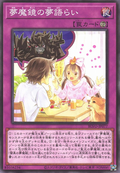 (2) During the Main Phase: You can send this face-up card from the Spell & Trap Zone to the GY; place face-up in your Field Zone 1 “Dream Mirror of Joy” or “Dream Mirror of Terror” in your possession that is banished or in the GY, then you can Special Summon 1 monster from your hand that specifically lists that placed card’s name in its text.