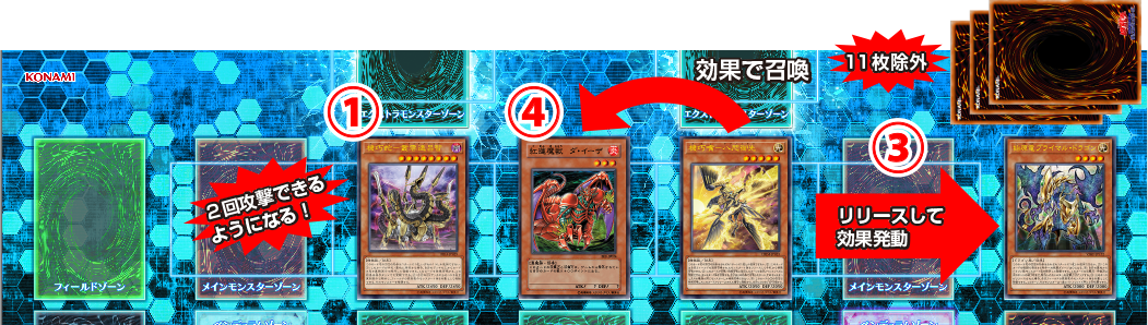 1. During the End Phase of your opponent’s turn, banish the top 8 cards of your Deck to Special Summon “Gizmek Orochi, the Serpentron Sky Slasher”.