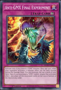 Activate only if you control a “GMX” monster. Once per turn, when your opponent activates a monster effect on the field (except during the Damage Step): You can excavate the top 5 cards of your Deck, then if you excavated a “GMX” card(s), negate that activated effect, also place all the excavated cards on the top or bottom of the Deck in any order.