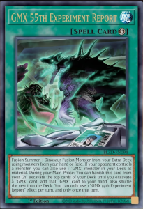 Fusion Summon 1 Dinosaur Fusion Monster from your Extra Deck using monsters from your hand or field. If your opponent controls a monster, you can also use 1 “GMX” monster in your Deck as Material. During your Main Phase: You can banish this card from your GY; excavate the top cards of your Deck until you excavate a “GMX” card, add that “GMX” card to your hand, also shuffle the rest into the Deck. You can only use 1 “GMX 55th Experiment Report” effect per turn, and only once that turn.