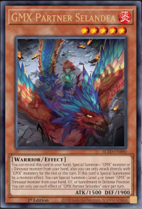 You can reveal this card in your hand; Special Summon 1 “GMX” monster or 1 Dinosaur monster from your hand, also you can only attack directly with “GMX” monsters for the rest of this turn. If this card is Special Summoned by a monster effect: You can Special Summon 1 Level 4 or lower “GMX” or Dinosaur monster from your hand, GY, or banishment in Defense Position. You can only use each effect of “GMX” Partner Selandea” once per turn.