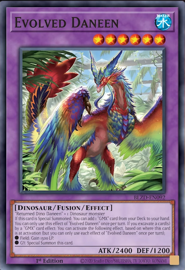 If this card is Special Summoned: You can add 1 “GMX” card from your Deck to your hand. You can only use this effect of “Evolved Daneen” once per turn. If you excavate a card(s) by a “GMX card effect: You can activate the following effect, based on where this card is at activation (but you can only use each effect of “Evolved Daneen” once per turn);