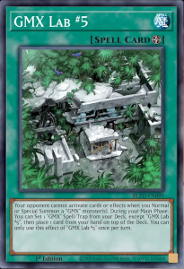 Your opponent cannot activate cards or effects when you Normal or Special Summon a “GMX” monster(s). During your Main Phase: You can Set 1 “GMX” Spell/Trap from your Deck, except “GMX Lab #5”, then place 1 card from your hand on top of the Deck. You can only use this effect of “GMX Lab #5” one per turn.