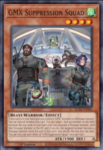 If this card is in your hand and you control a “GMX” monster or a Dinosaur Monster: You can Special Summon this card. You can target 1 face-up monster on the field; excavate the top cards of your Deck until you excavate a Dinosaur monster, send that Dinosaur monster to the GY, and if you do, the targeted monster becomes a Dinosaur monster (until the end of this turn), also shuffle the rest into the Deck. You can only use each effect of “GMX Suppression Squad” once per turn.
