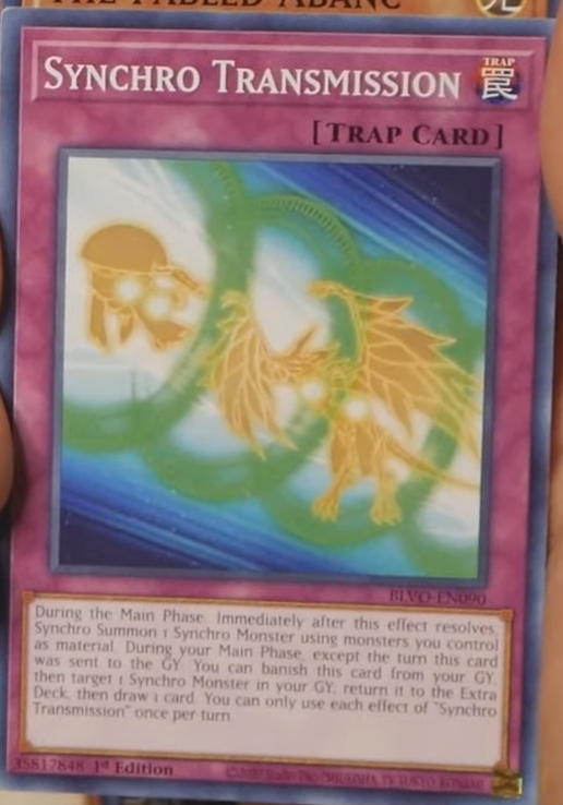 During the Main Phase: Immediately after this effect resolves, Synchro Summon 1 Synchro Monster using monsters you control as material. During your Main Phase, except the turn this card was sent to the GY: You can banish this card from your GY, then target 1 Synchro Monster in your GY; return it to the Extra Deck, then Draw 1 card. You can only use each effect of “Synchro Transmission” once per turn.