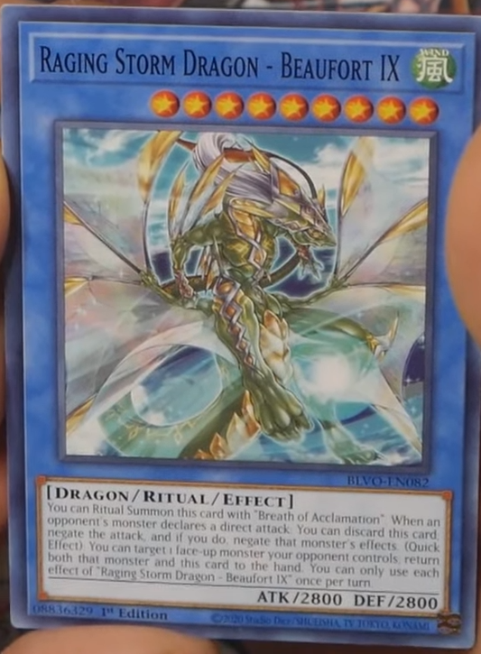 You can Ritual Summon this card with “Breath of Acclamation”. When an opponent’s monster declares a direct attack: You can discard this card; negate the attack, and if you do, negate that monster’s effects. (Quick Effect): You can target 1 face-up monster your opponent controls; return both that monster and this card to hand. You can only use each effect of “Raging Storm Dragon – Beaufort IX” once per turn.