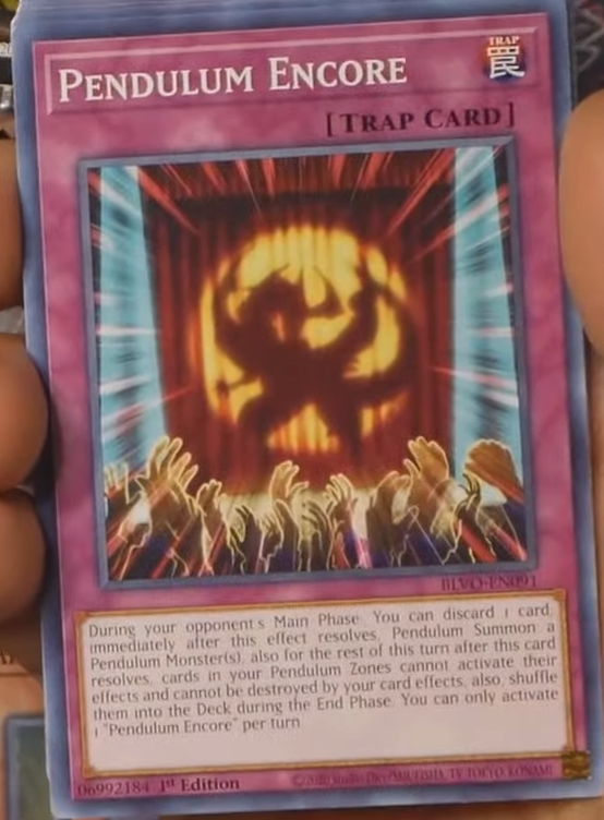 During your opponent’s Main Phase: You can discard 1 card; immediately after this effect resolves, Pendulum Summon a Pendulum Monster(s), also for the rest of this turn after this card resolves, cards in your Pendulum Zones cannot activate their effects and cannot be destroyed by your card effects, also, shuffle them into the deck during the End Phase. You can only activate 1 “Pendulum Encore” per turn.