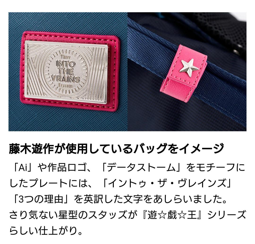 Yusaku’s bag is meant to have Ai and the idea of a Data Storm engraved on its plat buckle. “Into the Vrains” and “Three Reasons” in English are also on it.