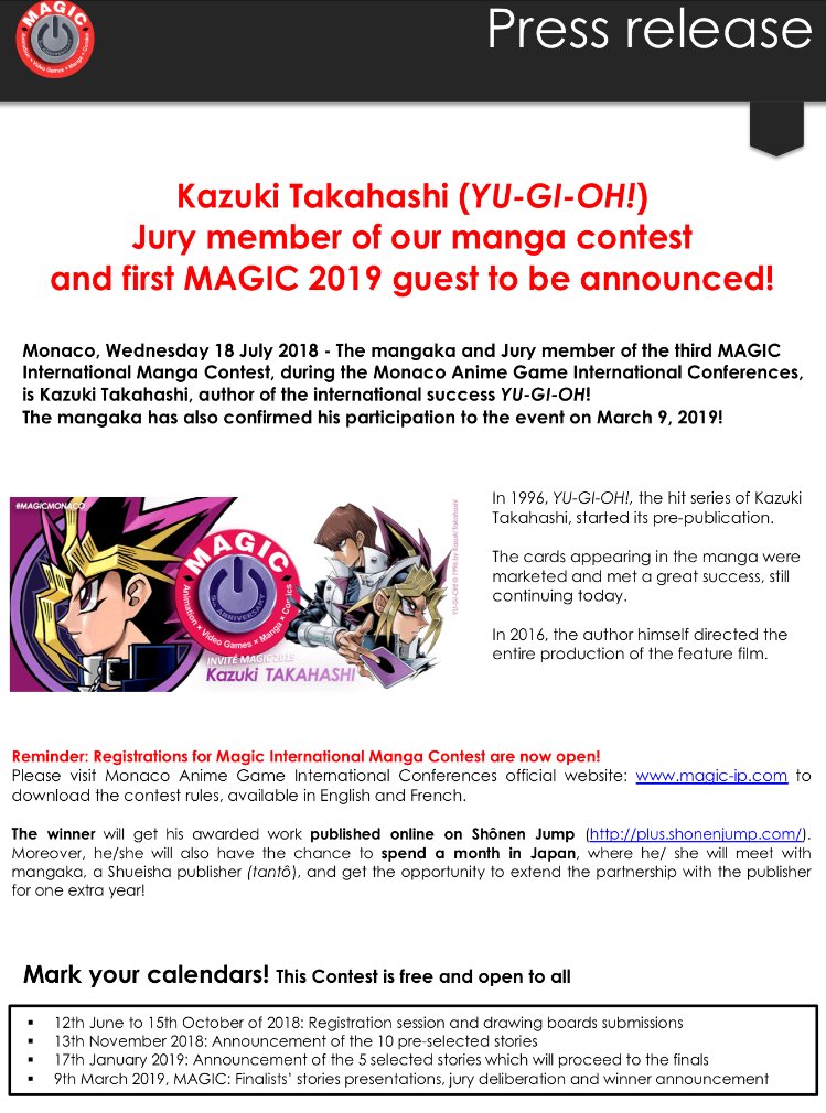 The third MAGIC International Manga Contest being held during the 2019 Monaco Anime Game International Conference will have Kazuki Takahashi, author of Yu-Gi-Oh! as one of jury panelists.