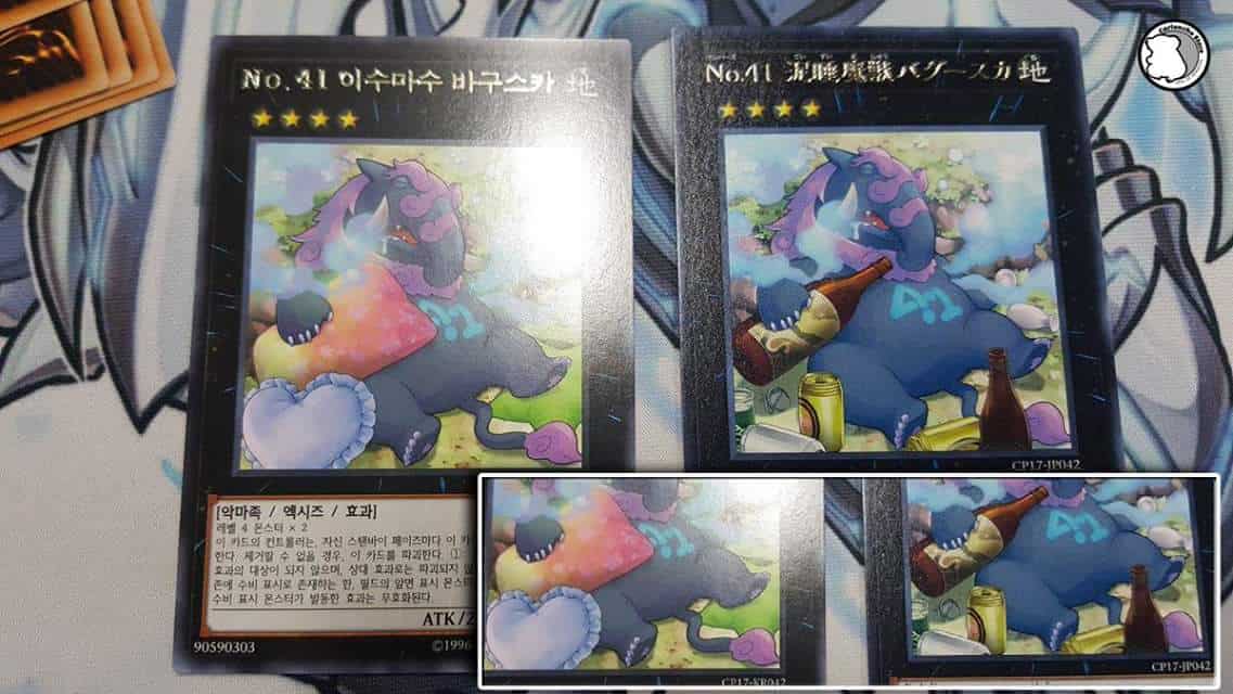 The Korean version of the 2017 Collector’s Pack has been released, and it includes an edited artwork for the card we’re calling “Number 41: Tapirnysus the Stupor Beast” (Japanese Name: No.41 泥睡魔獣バグースカ). The Korean version (which typically uses the same artwork the TCG gets) has the alcohol related references of the card removed in favor of giving it pillows.