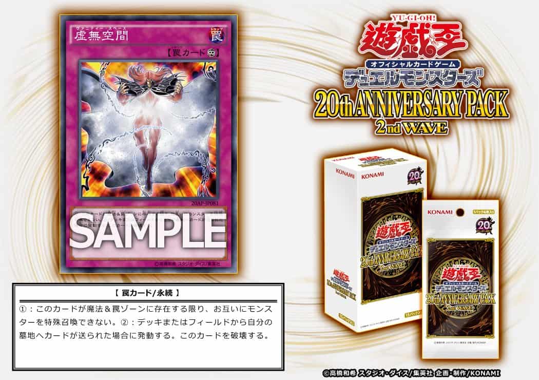 Join our Discord to discuss this article with fellow Duelists Become a Patron to support us for 12 years of all-volunteer work A major Trap Card used in the metagame of both CCGs is being reprinted in this anniversary pack. 20AP-JP081 虚無空間 Vanity’s Emptiness The last time it was reprinted in Japan was The Rarity Collection in December 2014! Source