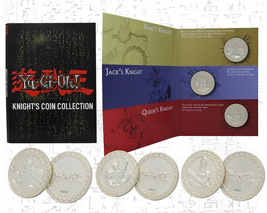 The Knight’s Coin Collection feature Yugi’s Three Musketeers of Face Cards (King’s, Queen’s and Jack’s Knight), each with their own 99.9% percent silver coin. Each coin is 38 mm (1.5 inches), and the set is limited to 5000 pieces.