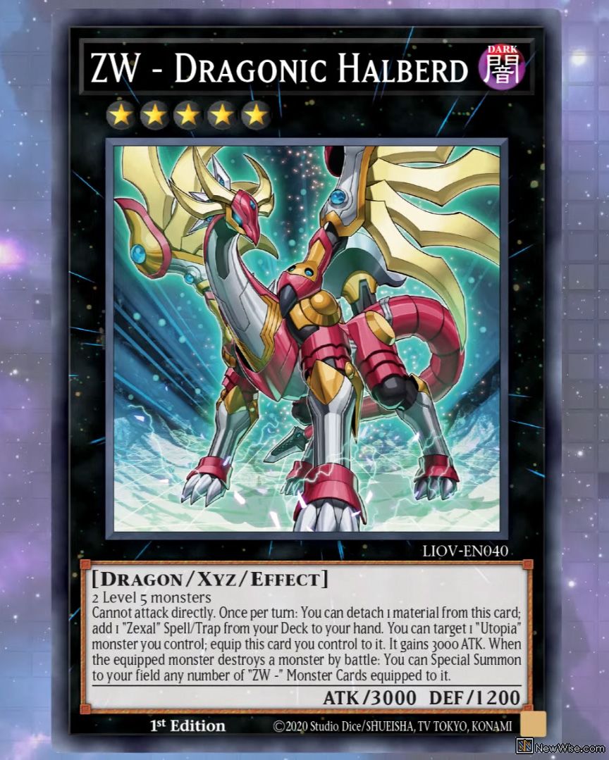 Cannot attack directly. Once per turn: You can detach 1 material from this card; add 1 “Zexal” Spell/Trap from your Deck to your hand. You can target 1 “Utopia” monster you control; equip this card you control to it. It gains 3000 ATK. When the equipped monster destroys a monster by battle: You can Special Summon to your field any number of “ZW -” Monster Cards equipped to it.