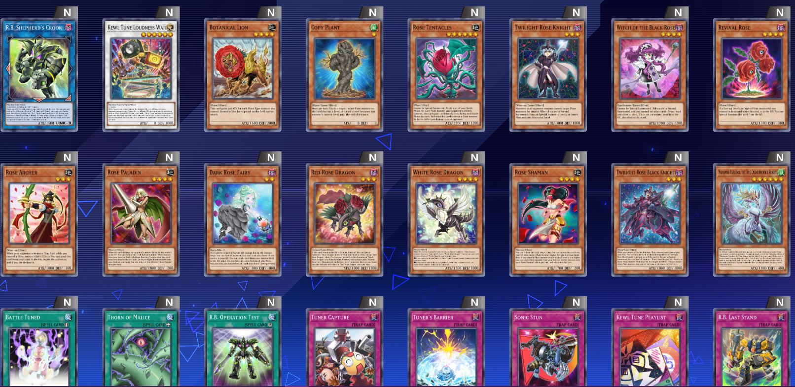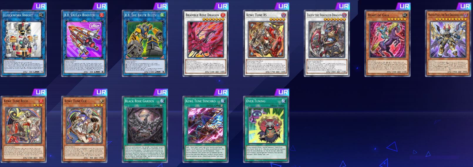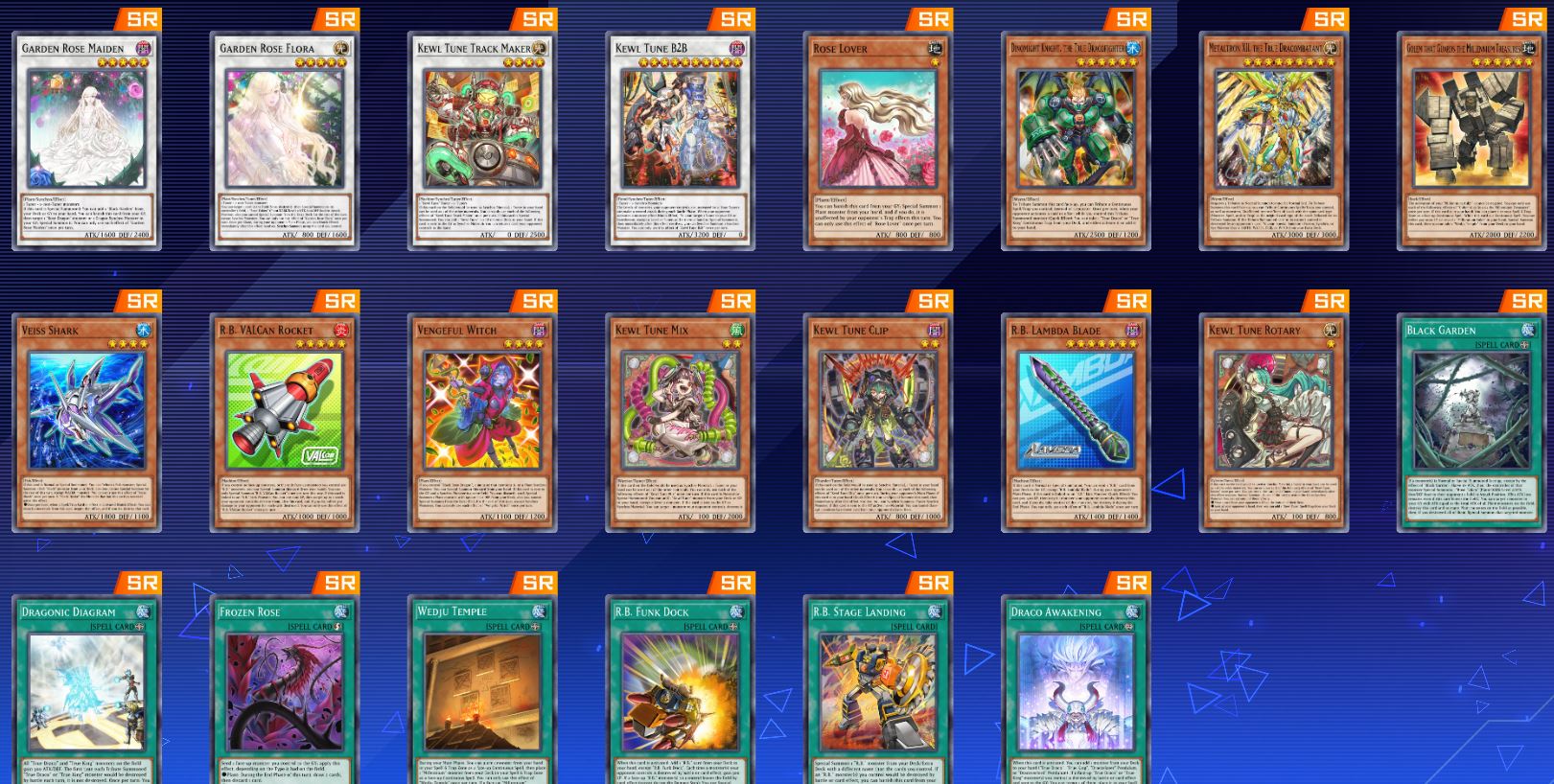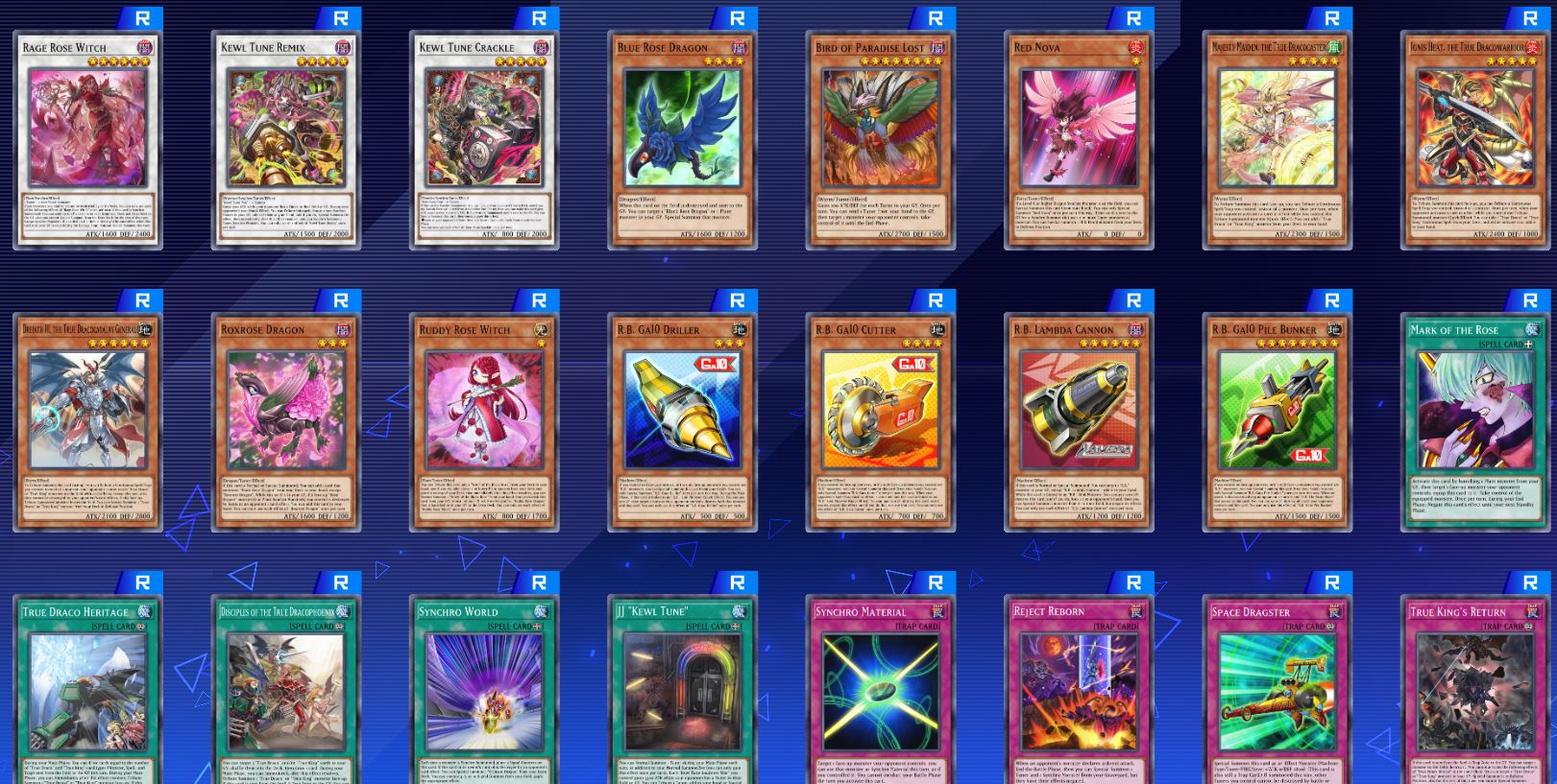 “Get caught up in the killer flow that’s sure to have everyone jumping! The “Kewl Tune” archetype, able to Synchro summon using only Tuners, is making some noise as it joins the battle! The “R.B.” archetype also lets you customize various parts in order to create potent Link Monster trump cards! “Bramble Rose Dragon” also arrives as a new ace for hthe “Rose Dragon” archetype! You won’t want to miss new cards such as the additional “Millennium” card “Heart of Gaia” and “”True Draco” or “True King”” cards either! So throw your hads in the air and let your fighting spirt carry to you victory!”