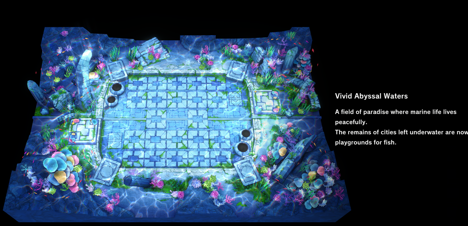 “A field of paradise where marine life lives peacefully. The remains of cities left underwater are now playgrounds for fish.”