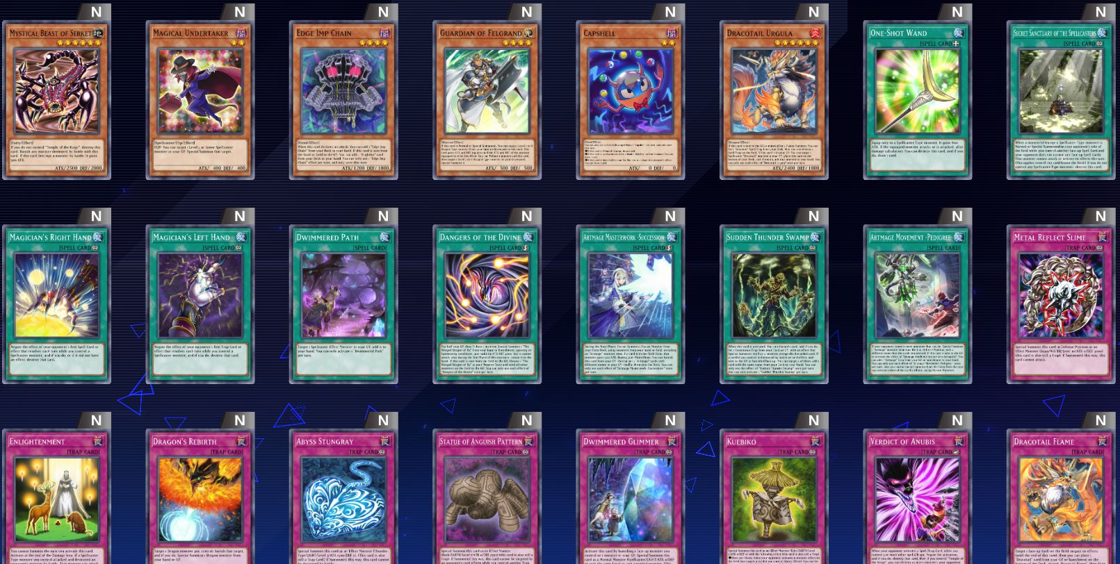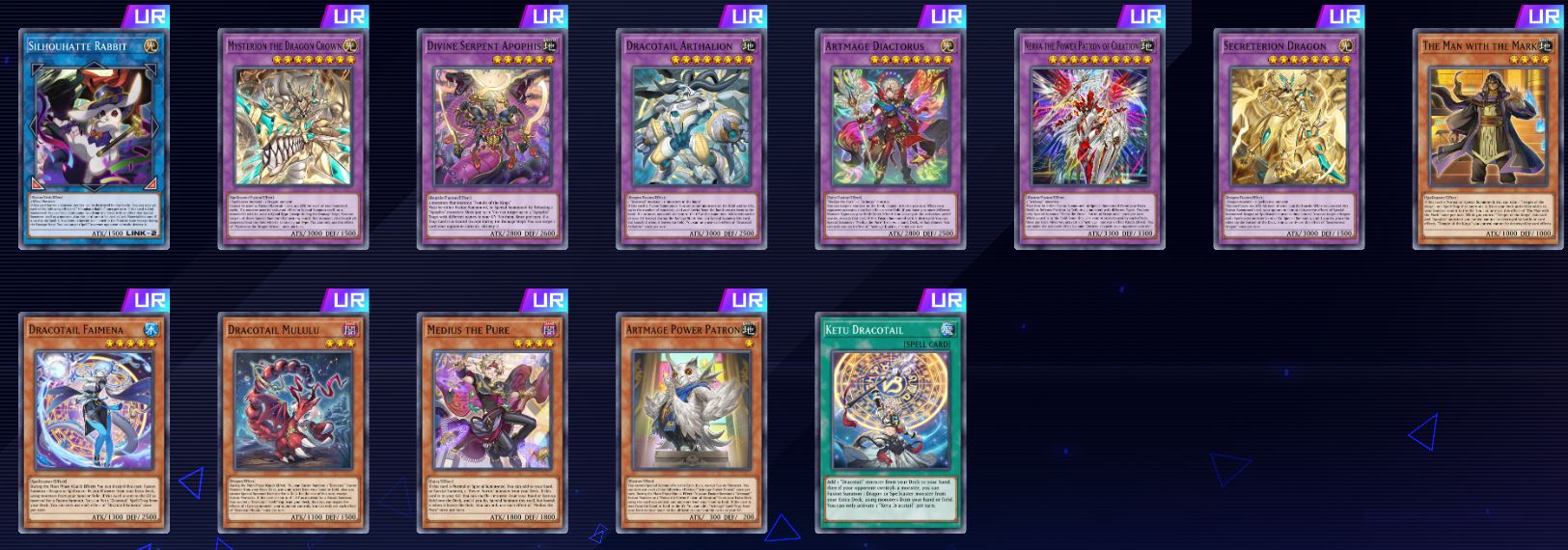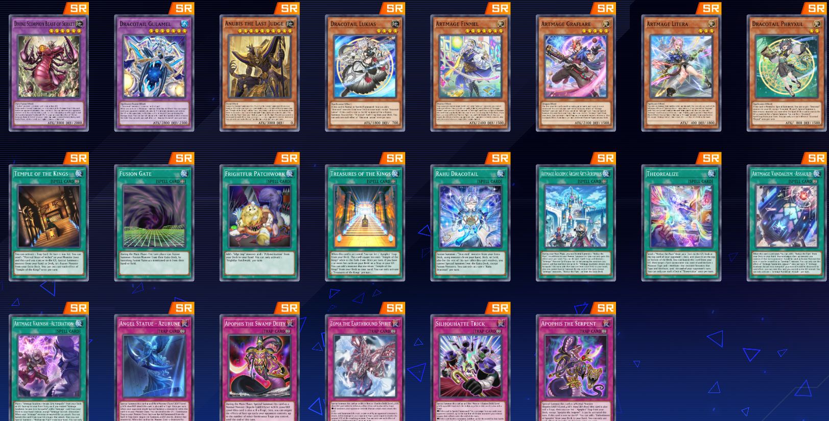 “Unleash hidden power and awaken the ultimate being! Enjoy this brand-new story, revolving around “Artmage” cards that actively fight their battles with Fusion Summoning! In addition to the mighty “Dracotail” that focuses on highly efficient Fusion strategies using Spellcaster and Dragon monsters, “Divine Serpent Apophis” also makes an appearance, luring those who defile the “Temple of the Kings” into a Trap nightmare! Become a top Duelist by using techniques that draw out your cards’ power!”
